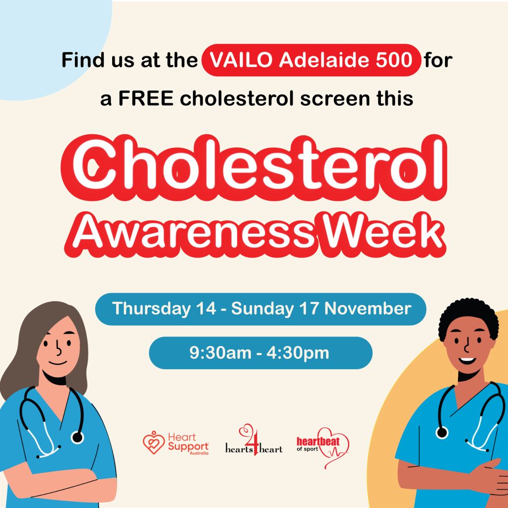 Hearts4heart, Heartbeat of Sport and Heart Support Australia are proud to support free heart screenings during Cholesterol Awareness Week at the VAILO Adelaide 500 from 14 – 17 November from 9.30 am to 4.30 pm.