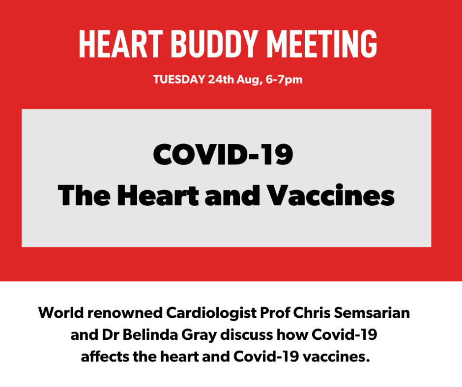 Heart Buddy Group. We hope you can join us tomorrow (Tues 24th) for our Heart Buddy Meeting on COVID-19 – The Heart and Vaccines. World renowned cardiologist Prof Chris Semsarian and Dr Belinda Gray will discuss how Covid-19 affects the heart and Covid vaccines. There will be an opportunity for Q&A at the end. Carers, family and friends are welcome!